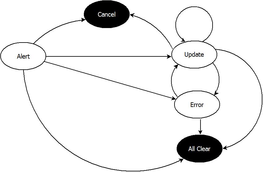 5) | Alert ---> Update ... Update ---> Error ---> Update ... Update ---> All Clear | Error means the previous message had false values, thus, the msg with errors should be followed by an error-less message example - similar to example in 3) above, instead the the message "priority" was mistakenly set to "urgent" during an update, then a follow up message is issued to correct the "priority" to "high", in which case the msgType is set to "Error". Thereafter, the transitions can be as any of the above terminating with an "All Clear" message |