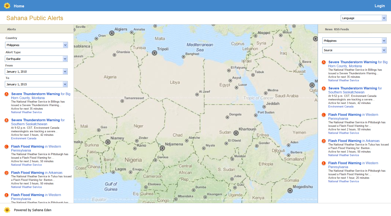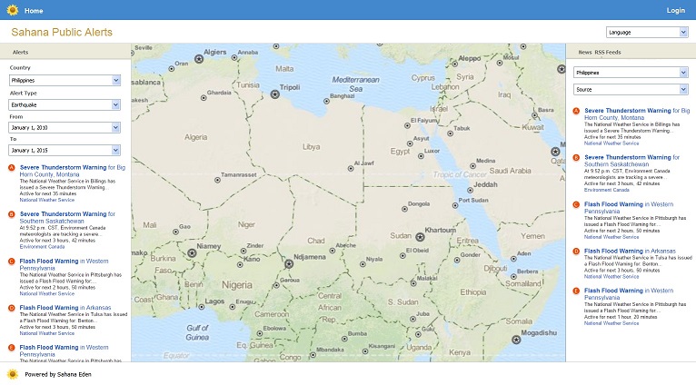 This page is essentially the HOME visible to the public; it will display public alerts only; where cap:alert:scope = "public". All other alerts are only available to those authorized with a login