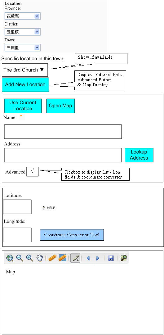- Q: Should we save a new location automatically upon submission of main form (as now) or else have a manual Save button?