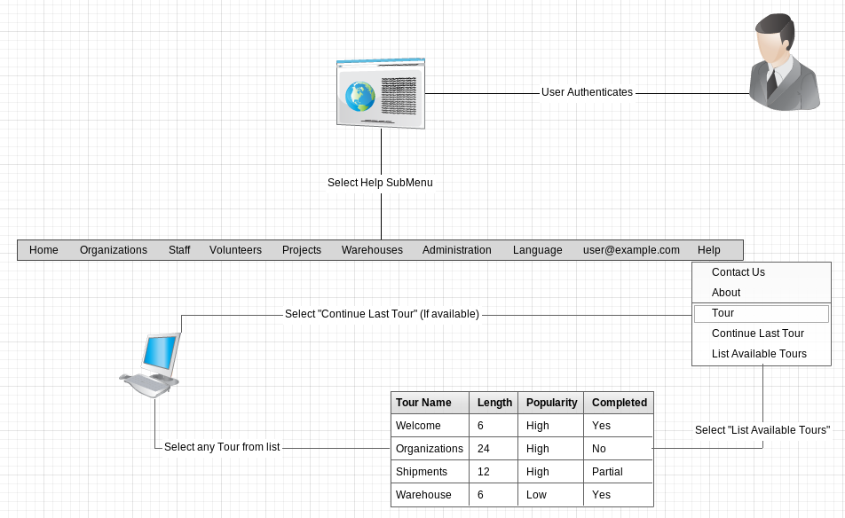 - Once a guided tour has been set up you can run it from the Help menu. The prepop data will create two demo guided tours. Both are called "Welcome Tour" and one is available for unauthenticated users and the other for authenticated users. The authenticated version will span two pages.