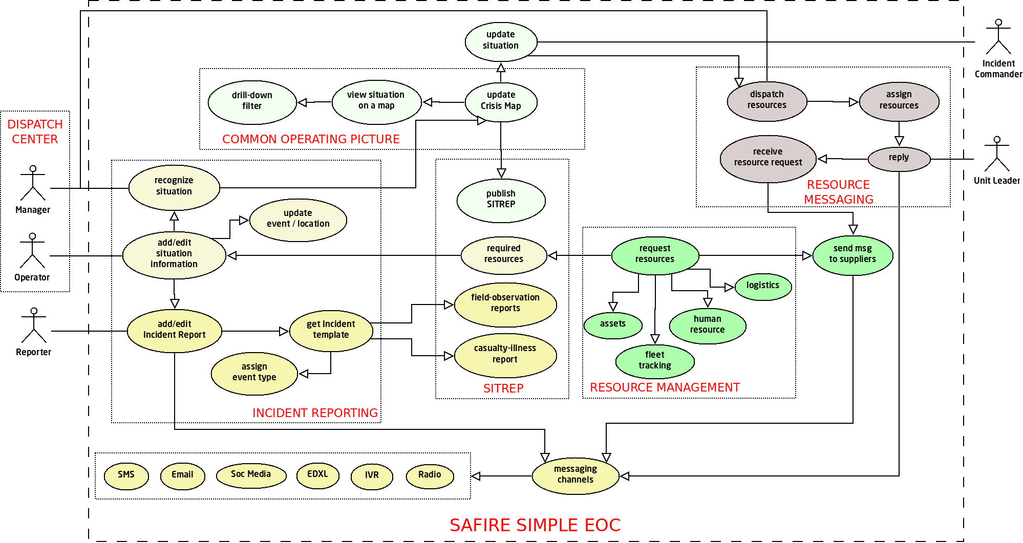 Sahana First Response (SAFIRE) is designed to support a Simple All-Hazard Emergency Operation Center (EOC); especially during the 72 hour golden window. The An EOC could be as simple as a single terminal with a single user (e.g. a call center) recording incident reports and dispatching an emergency service. The emergency service might be the maintenance engineering crew of a telecommunications service provider deployed to fix a backup power generator.