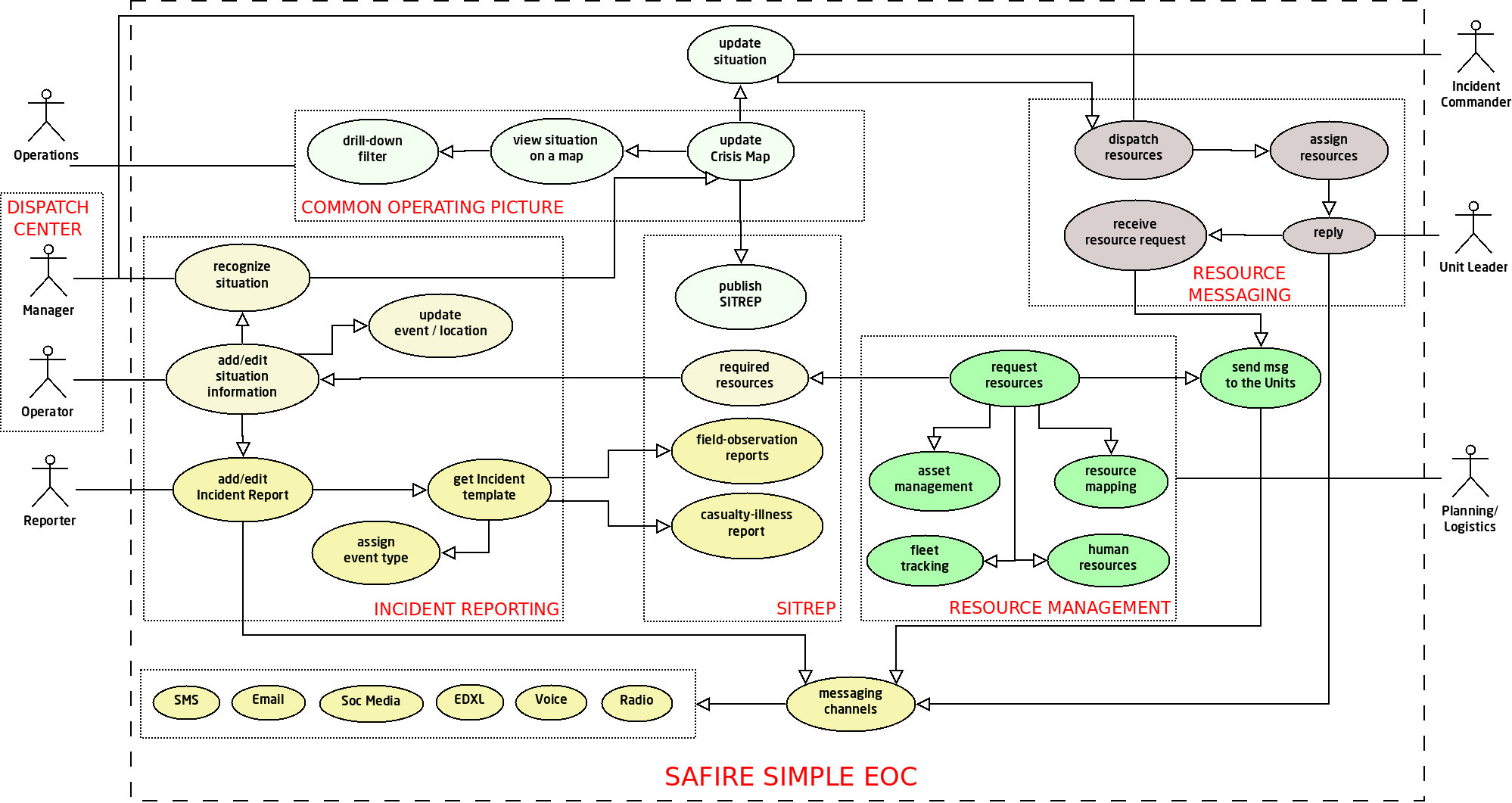 SAFIRE is a Sahana Eden template combining various modules to support the work flows of a simple EOC from incident report inception through a cycle until the situation is contained. Important SAFIRE features:
