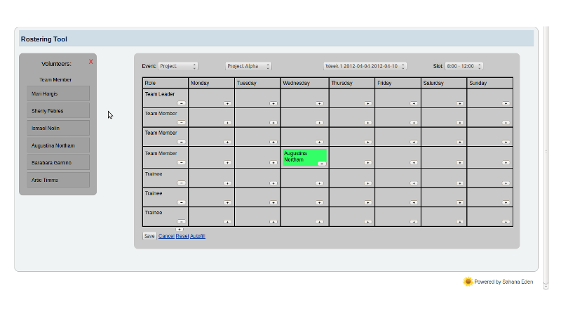 - The list of the volunteers / people / employees will be pulled up from the database and then populated next to the roster tool for the admin to select and generate a roster.