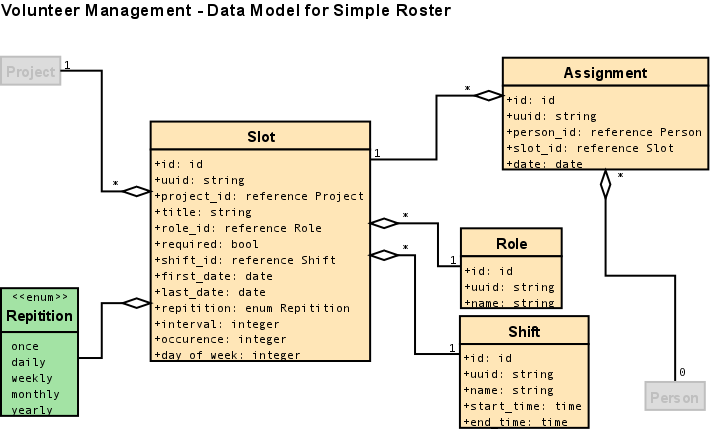 The Roster Tool is a tool to assign volunteers to shifts (time slots) of scheduled work in a project.