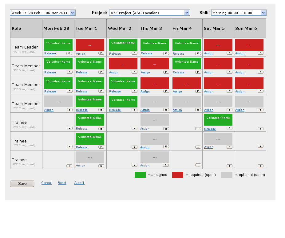 - Roster ability to assign volunteer work on time place grid.