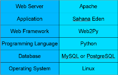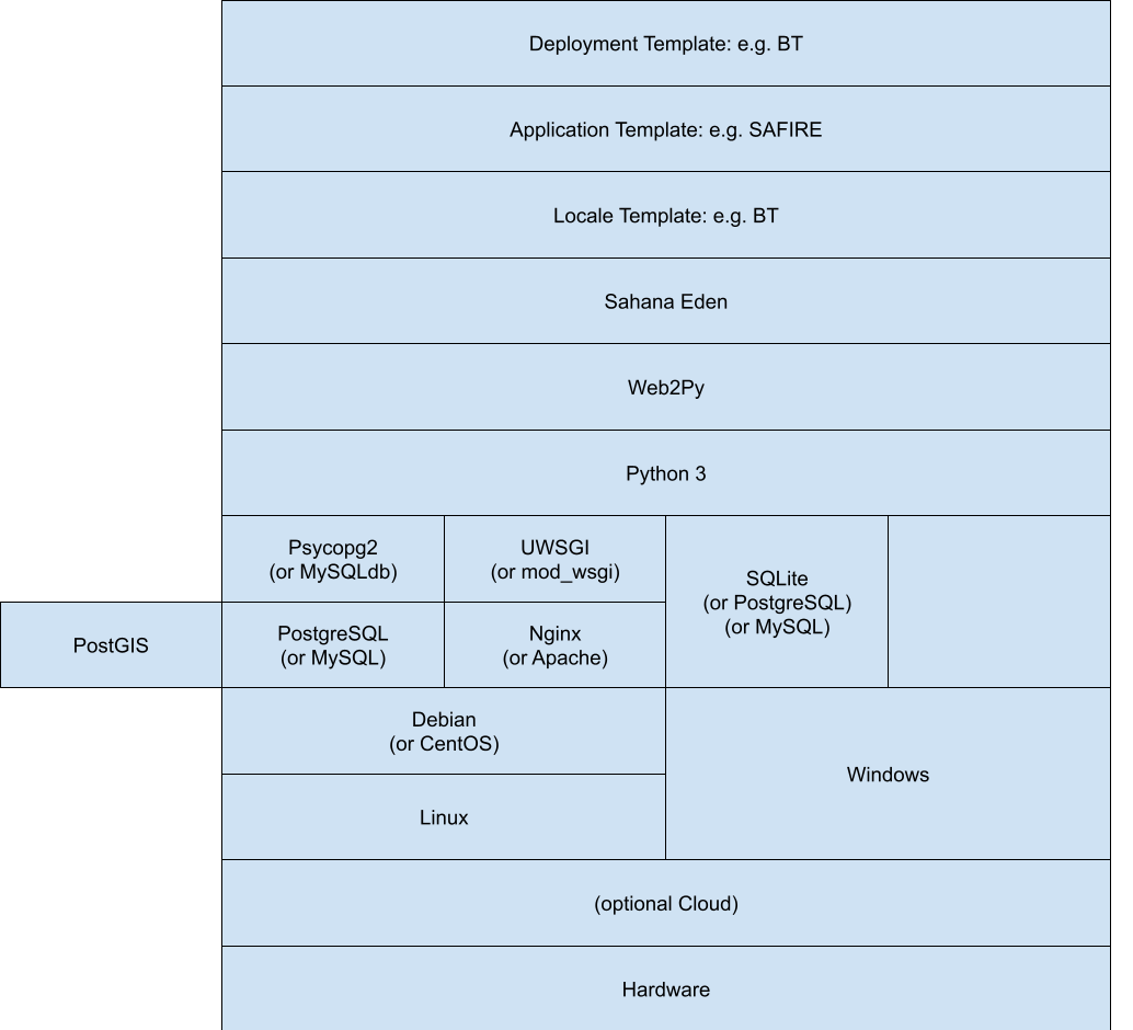 Sahana Eden is designed to be deployed flexibly from lightweight laptop installs to highly-available cloud deployments, so it supports a range of stacks.