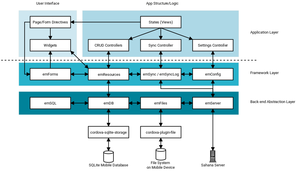 The back-end abstraction layer provides abstract interfaces to external components - which are mainly the mobile database, the device's file system and the Sahana Eden server.