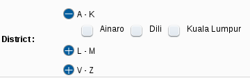 <div class="s3-groupedopts-widget"> <div class="s3-groupedopts-label expanded">A - K</div> <table class="s3-groupedopts-widget" style=""> <tbody> <tr> <td> <input id="s3-groupedopts-option-1-0" class="s3-groupedopts-option" type="checkbox" value="Ainaro" name="s3-groupedopts-2"> <label for="s3-groupedopts-option-1-0">Ainaro</label> </td> <td> <input id="s3-groupedopts-option-1-1" class="s3-groupedopts-option" type="checkbox" value="Dili" name="s3-groupedopts-2"> <label for="s3-groupedopts-option-1-1">Dili</label> </td> <td> <input id="s3-groupedopts-option-1-2" class="s3-groupedopts-option" type="checkbox" value="Kuala Lumpur" name="s3-groupedopts-2"> <label for="s3-groupedopts-option-1-2">Kuala Lumpur</label> </td> </tr> </tbody> </table> <div class="s3-groupedopts-label">L - M</div> <table class="s3-groupedopts-widget" style="display: none;"> ... </table> <div class="s3-groupedopts-label">V - Z</div> <table class="s3-groupedopts-widget" style="display: none;"> ... </table> </div>