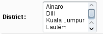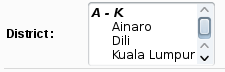<select multiple="multiple"> <optgroup label="A - K"> <option value="Ainaro">Ainaro</option> <option value="Dili">Dili</option> <option value="Kuala Lumpur">Kuala Lumpur</option> </optgroup> <optgroup label="L - M"> <option value="Lautém">Lautém</option> <option value="Manatuto">Manatuto</option> <option value="Manufahi">Manufahi</option> </optgroup> <optgroup label="V - Z"> <option value="Viqueque">Viqueque</option> </optgroup> </select>