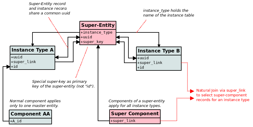 A super-entity stores (tablename, uuid) pairs which identify records across multiple tables, and the primary key of the super-entity (super-key) can then be used for foreign key constraints to link components. The primary key of the super-entity is usually referred to as super-key, and the respective foreign key constraints are called super-link.