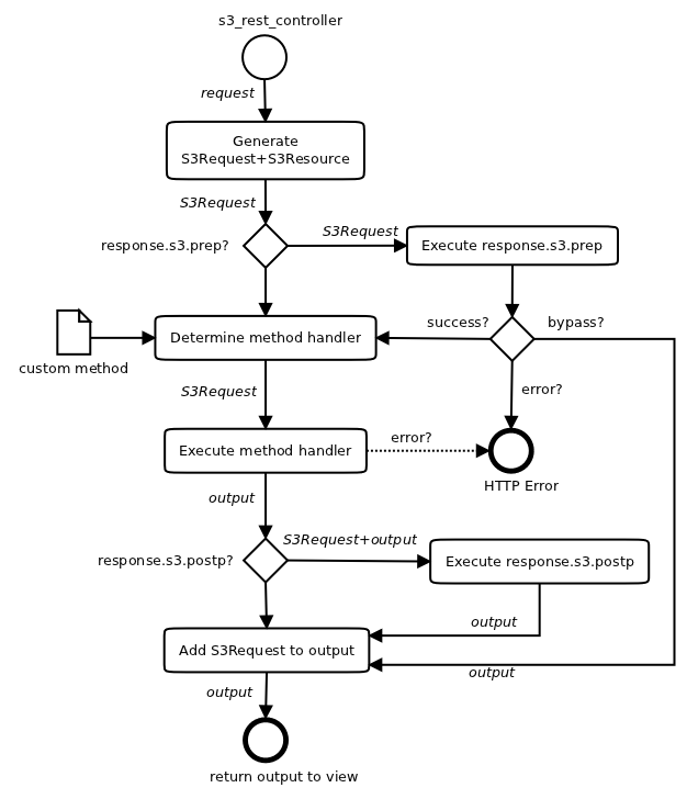 The s3_rest_controller function is a helper function which easily apply the RESTful API over your controller. Every time user request for a resource the s3_rest_controller function is called and return an output which then is passed to the view. The above diagram explains how a s3_rest_controller responds to request and gives the generate the desired output.