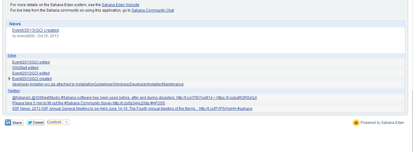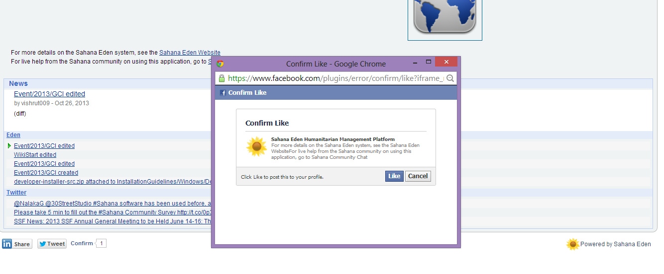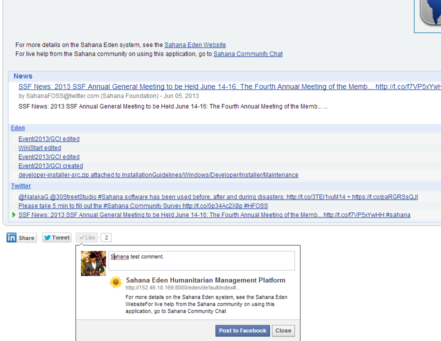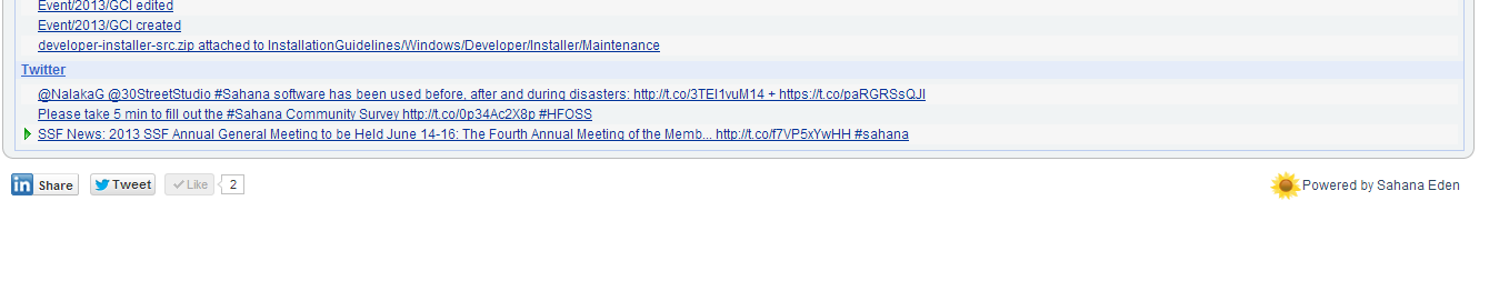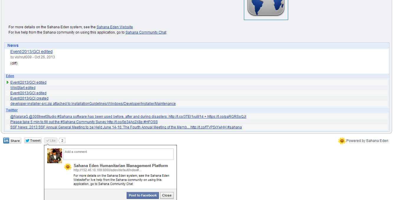A toolbar can be enabled to share Sahana pages via Social Media. The setting is enabled in either models/000_config.py