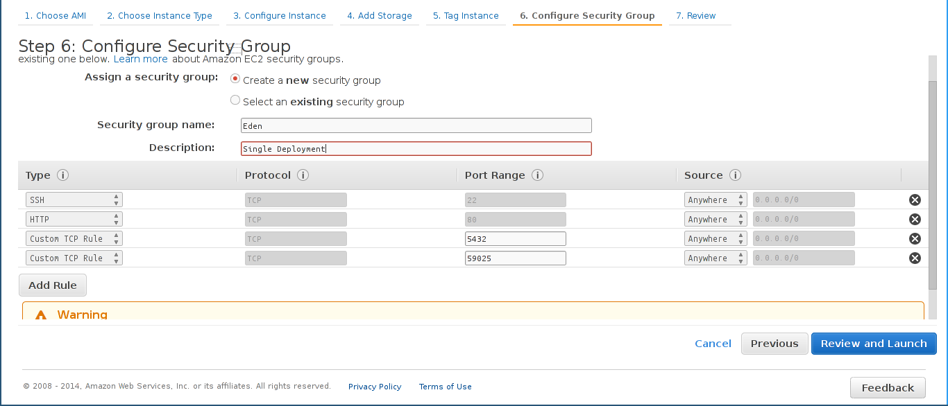 - Create a new security group with rules as displayed below (for production instance).