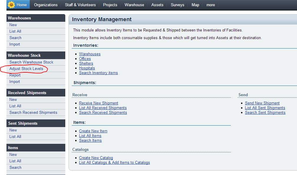 - On the left task-bar, under the heading “Warehouse stock”, you should see “Adjust Stock Levels”. Click on it.