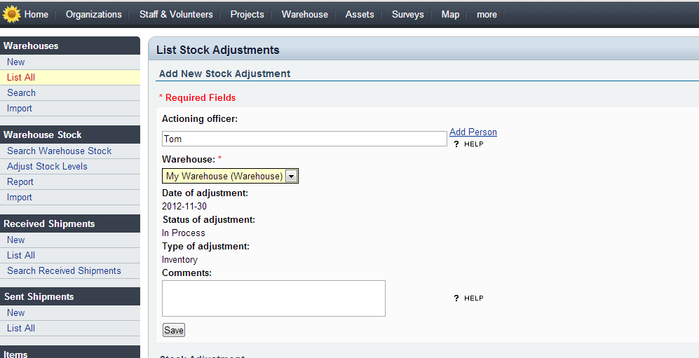 4) Input the name of person doing the transaction, warehouse and comments (if any) and click save.