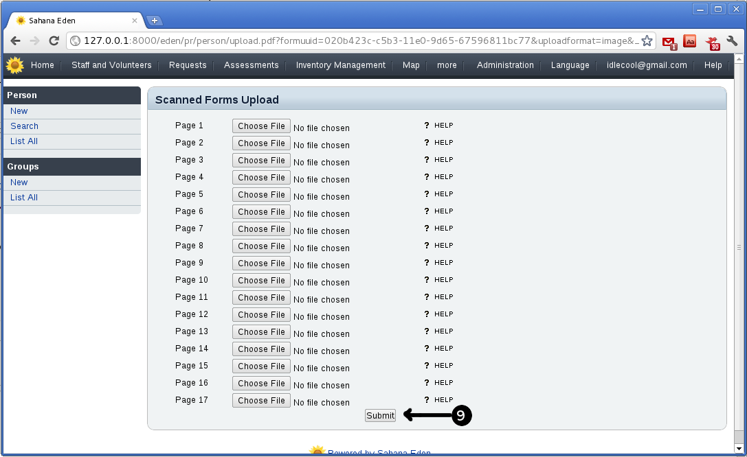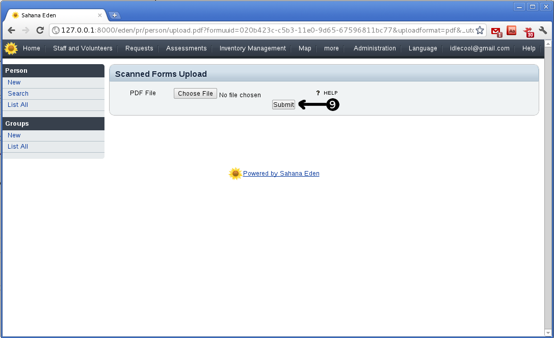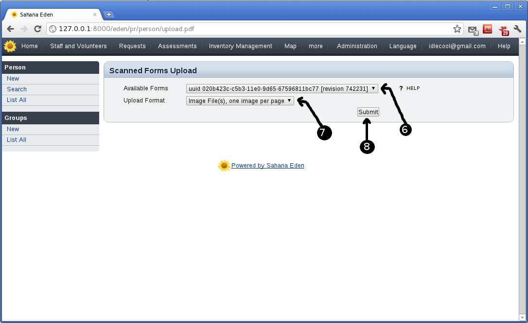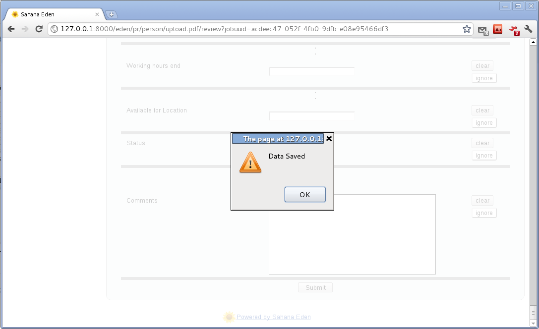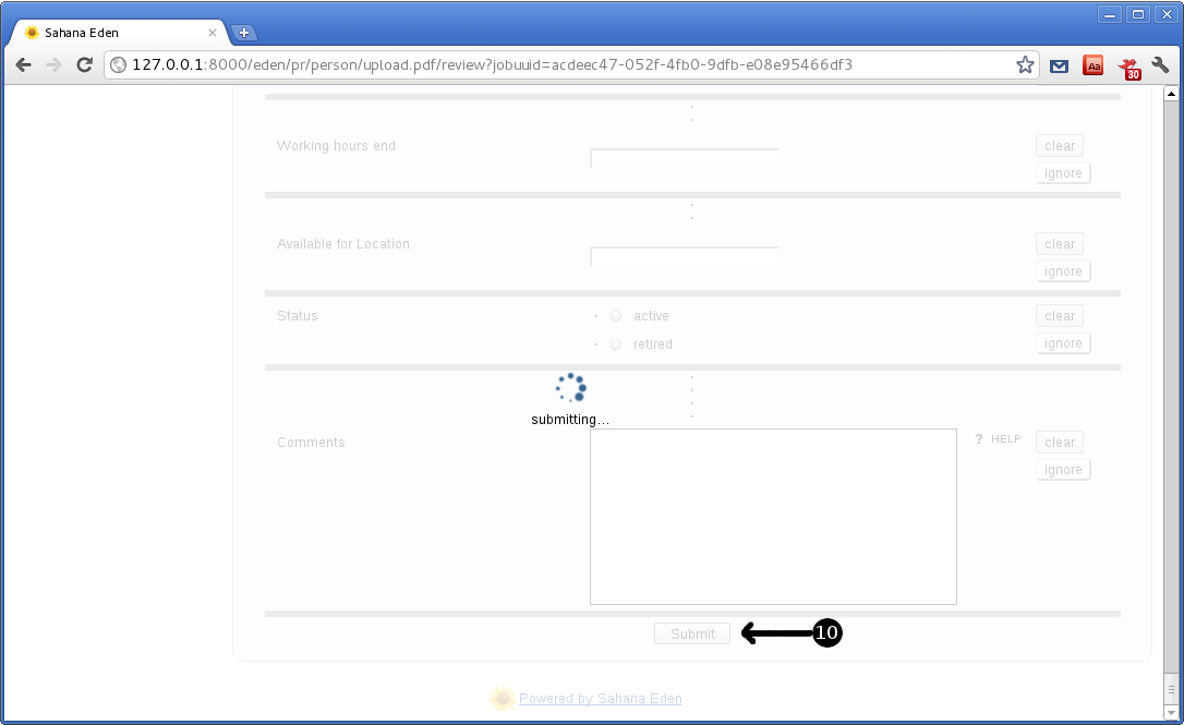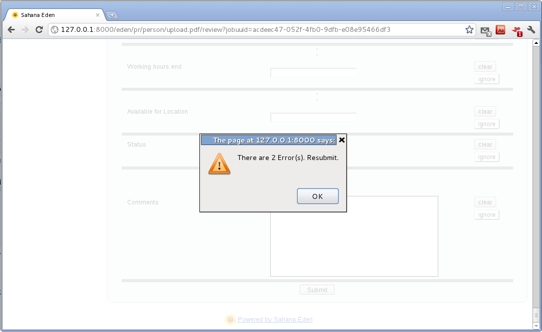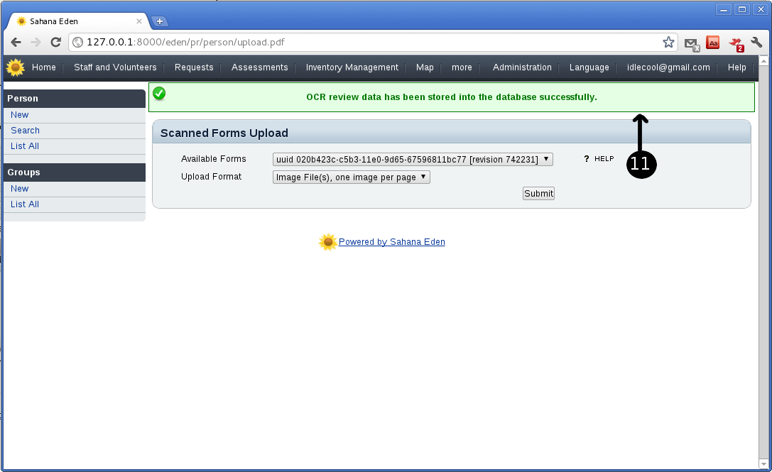 After paper based data collection, the forms can be scanned back on to the computer and uploaded to Sahana Eden servers which requires Internet connection. Those uploaded forms are read by Sahana Eden server(s) and the recognised text is then made ready for review by the volunteer who can verify and check for errors (if any) and finally submit it.