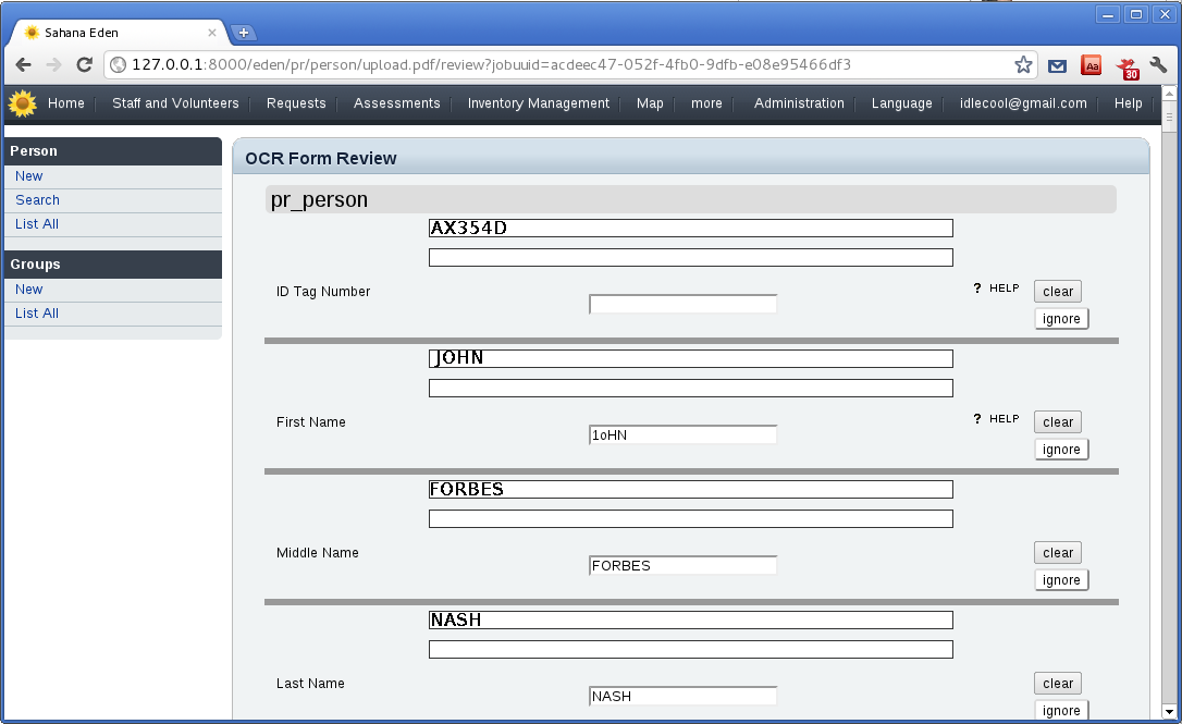 After OCRing is complete a page will be displayed. which will have all fields which were on the paper based form and corresponding input box image from the original form. This is called Review User Interface, here you (or Volunteer) can update the fields with correct data. If any field is unreadable and you do not want to include it in data submission then you can simply click on the ignore