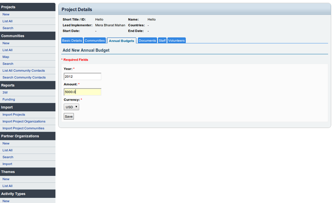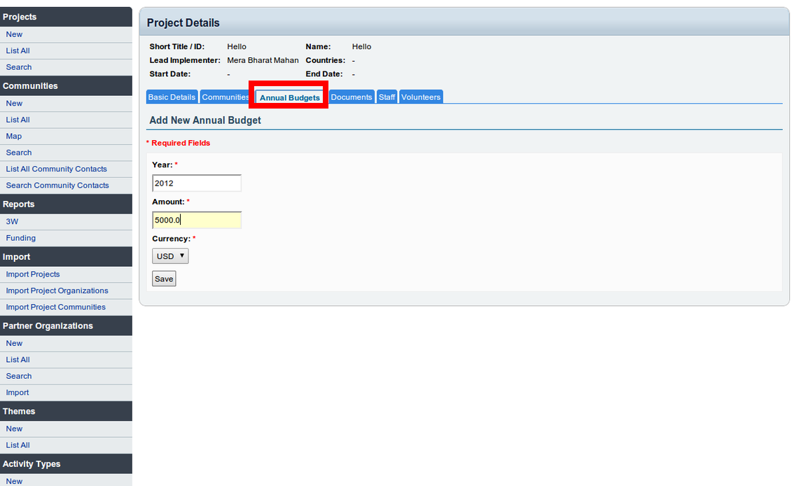 Now you would need to click on ‘Open’ on the project of your choice. Its the project to which you want to add the annual budget. Once you have clicked on Open, click on Annual Budgets tab. You would see a form to fill the details. See Troubleshooting section if you don't see the tab. In the form, fill the year, amount and select the currency. All three fields are necessary. Once done, click on Save and you would receive a confirmation message saying ‘New Annual Budget Created’.