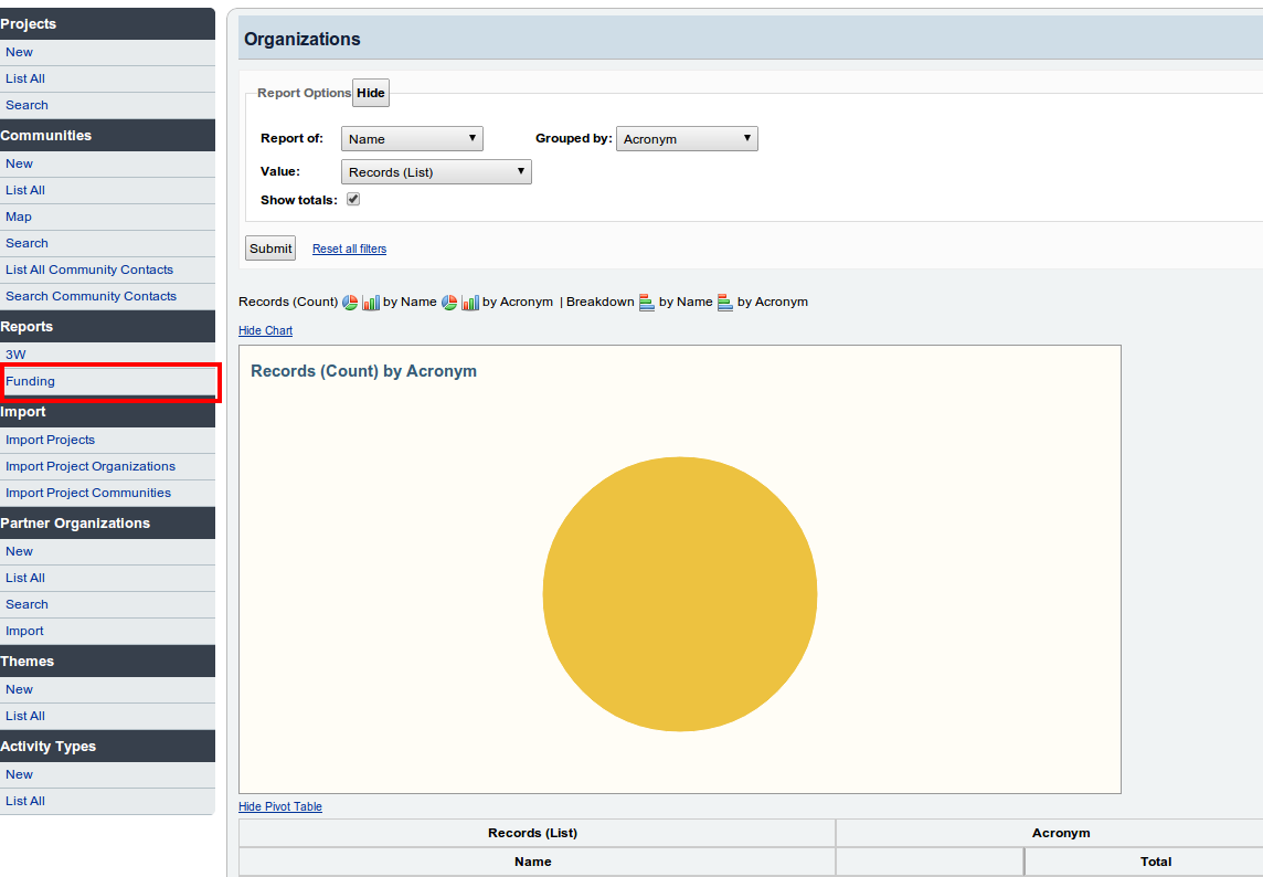 To produce a funding report, click on ‘Funding’ in the Reports section in Left side menu. Here you should be able to produce the reports. Click ‘Show’ in Report Options to edit the options. Select your choices and click Submit. You can see the charts and graphs by clicking on the icons above the pivot table.
