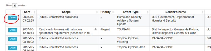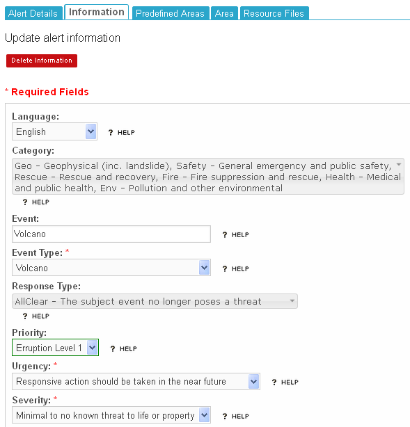 - Click on theEvent Type drop down list and select the relevant event type. If the Warning Priority for that event type is defined, selecting the event type will trigger the Warning Priority drop down to be populated. Then selecting the relevant warning priority triggers the programmed Urgency, Severity and Certainty field to be populated.