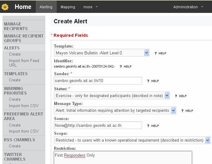- To create a new alert message click on the main menu Alerting and then in the sub menu item Alert select Create